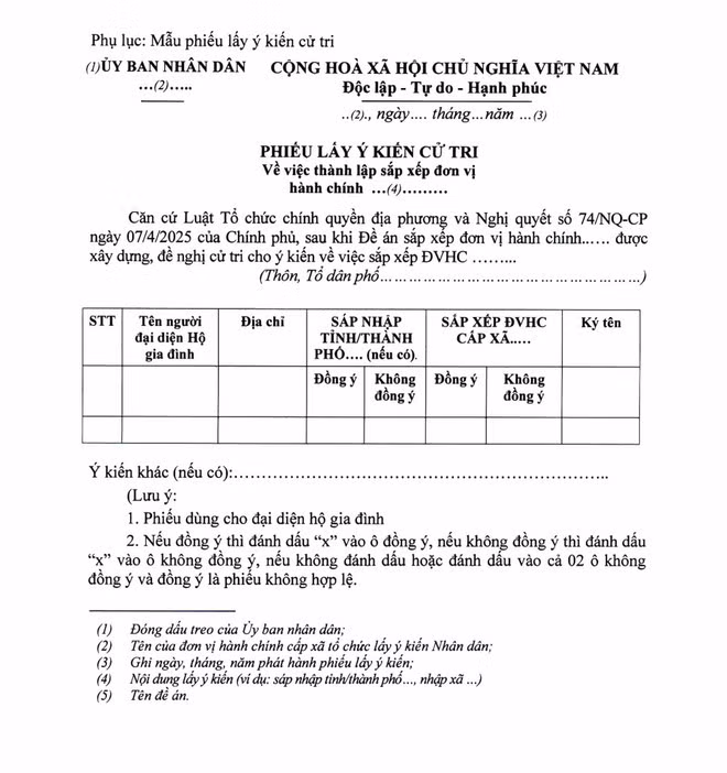 Để bảo đảm thống nhất về nội dung, trình tự, thủ tục lấy ý kiến nhân dân tại địa phương, Ban Chỉ đạo sắp xếp đơn vị hành chính các cấp và xây dựng mô hình tổ chức chính quyền địa phương 2 cấp đề nghị Ủy ban nhân dân cấp tỉnh có thể lựa chọn hình thức phát phiếu lấy ý kiến (theo mẫu tại Công văn số 03/CV-BCĐ) hoặc lựa chọn các hình thức phù hợp khác như lấy phiếu qua trang thông tin điện tử, họp đại diện hộ gia đình tại đơn vị hành chính cấp xã, thôn, tổ dân phố để biểu quyết...